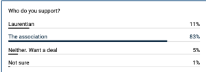 The poll asks readers who they support in the ongoing labour dispute that has seen the professors on strike since January 19. It asks simply, Who do you support? Four options are provided: (1) Laurentian; (2) The association; (3) Neither, Want a Deal; and (4) Not sure. The poll was posted yesterday (Jan 29) and as of the moment I am writing this, the results are 83% in favour of the profs/association and only 11% in favour of the employer. Take from that what you want.